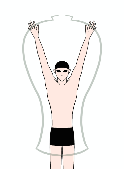 여기서 한가지 포인트는 물잡기를 할 때, 어깨를 움츠리지 않도록 해야 합니다. 어깨가 귀에 닿을 정도로 움츠리면 동작이 작아져서 아무리 힘을 줘도 물을 멀리 밀어내지 못합니다. 물속 동작이 작아지면 호흡하는 것이 힘들어지고 속도를 내는 것은 더욱 어려워집니다. 가슴을 펴고 어깨를 내리고 팔동작을 크게 할 수 있도록 해야합니다.