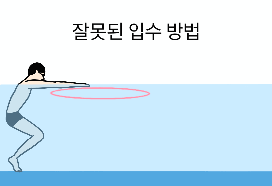 마지막으로 물속으로 들어갈 때 수직으로 내려가려고 하면 안 됩니다. 이렇게 수직으로 내려가게 되면 앞으로 전진할 수 없습니다. 속력이 나지 않기 때문에 물을 타고 멀리 나가는 글라이딩 거리가 짧아지고 자세가 흐트러질 수 있습니다. 또 몸의 굴곡이 커지기 때문에 허리에 통증이 생깁니다.