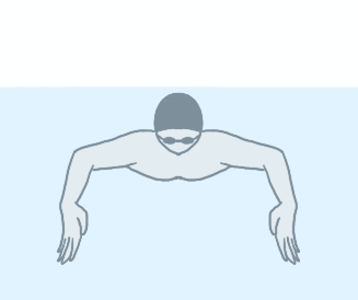 주의) 다시 물 속으로 들어가기 전에 어깨를 모아 몸통을 최대한 작게 만들면 정면에서 받는 조금 더 저항을 줄일 수 있습니다. 물 속으로 들어간 후에는 팔꿈치를 곧게 펴고 모은 손을 때어 양손 손바닥이 수영장 바닥을 향하는 준비자세로 돌아갑니다. 이 때는 속도가 붙어서 앞으로 나아가는 구간이기 때문에 발끝부터 손끝까지 곧게 뻗은 자세를 만들어 빠르게 나아갈 수 있도록 합니다.