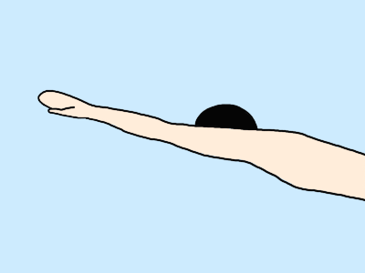 주의) 다시 물 속으로 들어가기 전에 어깨를 모아 몸통을 최대한 작게 만들면 정면에서 받는 조금 더 저항을 줄일 수 있습니다. 물 속으로 들어간 후에는 팔꿈치를 곧게 펴고 모은 손을 때어 양손 손바닥이 수영장 바닥을 향하는 준비자세로 돌아갑니다. 이 때는 속도가 붙어서 앞으로 나아가는 구간이기 때문에 발끝부터 손끝까지 곧게 뻗은 자세를 만들어 빠르게 나아갈 수 있도록 합니다.