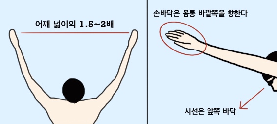 주의) 팔을 너무 작게 벌리면 누르는 물의 양이 작아 추진력을 만들어 호흡을 하기에 충분하지 않습니다. 또 팔을 너무 크게 벌리면 저항을 많이 받아 속력이 줄어들게 됩니다. 저항을 줄여 추진력을 얻고 호흡하기에 충분할 만큼만 팔을 벌려야 합니다.