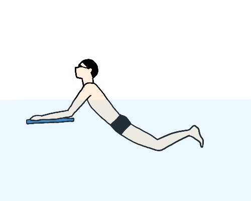 킥판을 잡고 머리를 들고 발차기 연습을 할 때 상체를 과도하게 들면 몸이 일직선이 되지 않기 때문에 다리가 가라앉습니다. 킥판을 잡고 머리를 들고 발차기를 할 때는 귀가 어깨에 닿을 만큼 머리를 낮춰주어야 합니다. 그래야 몸이 일직선이 될 수 있습니다. 또 상체를 과도하게 들고 발차기를 하면 척추가 일직선이 되지 못하고 꺾이면서 허리의 통증을 유발할 수 있습니다. 만약 이미 허리에 통증을 가지고 있는 사람이라면 접영, 평영뿐만 아니라 자유형 발차기 연습도 조심하셔야 합니다. 허리의 통증을 가지고 있는 일반인들은 복근이 약한 경우가 대부분입니다. 그래서 머리를 들고 엎드려 발차기 연습을 할 때 복근이 척추를 제대로 지탱해주지 못하기 때문에 통증을 유발할 수 있습니다. 이럴 때는 머리를 들고 발차기 연습을 하는 것을 삼갑니다. 머리를 물속에 넣고 허리의 부담을 줄여주어야 합니다. 만약, 머리를 물 속에 넣고 발차기를 해도 허리가 아프다면 발차기를 할 때 다리를 엉덩이 위로 과도하게 올리는 것은 아닌지 의심해보아야 합니다.
